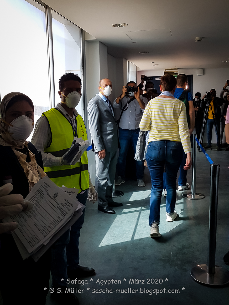 Ankunft Ägypten ... wir merken, dass wir aus einem Risikogebiet einfliegen ... Temperatur wird direkt nach dem Aussteigen gemessen und ein Fernsehteam dokumentiert diesen sensationellen Ablauf ... jetzt noch ein wenig Autofahren und dann geht's los mit der Erholung.